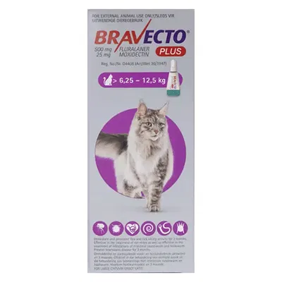Bravecto Plus purple is indicated for the treatment of tick and flea infestations in cats. Bravecto Plus 1.79ml is a systemic insecticide and acaricide that provides immediate and persistent flea (Ctenocephalides felis) and tick (Ixodes ricinus, Ixodes scapularis, Rhipicephalus sanguineus and Haemaphysalis spp.) killing activity for 3 months. It is also used for the treatment of ear mites (Otodectes cynotis) in cats and for the prevention of heartworm disease caused by Dirofilaria immitis for 3 months. The topical solution is recommended for the treatment of infestations of intestinal roundworm (Toxocara cati; fourth stage larvae, immature adults and adults) and hookworm (Ancylostoma tubaeforme; fourth stage larvae, immature adults and adults). Bravecto Plus spot on can also be used as part of a treatment strategy for flea allergy dermatitis.