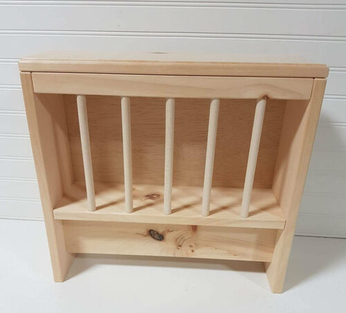 The feeder lid is hinged to allow hay to be added from the top and the dowel rods are easily replaceable if necessary.